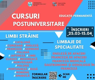 Facultatea de Litere a Universității „Alexandru Ioan Cuza” din Iași anunță deschiderea înscrierilor pentru o serie de cursuri postuniversitare de educație permanentă (PEP) în domeniul limbilor străine și al limbajelor de specialitate. Aceste cursuri sunt dedicate exclusiv absolvenților de studii superioare, indiferent de domeniul în …
