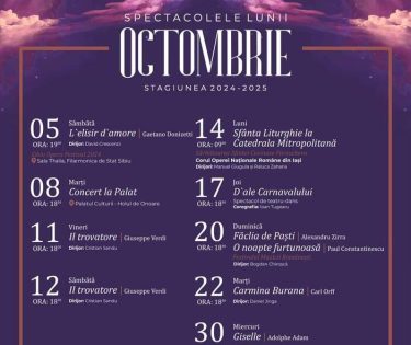 Luna octombrie ne aduce un program muzical plin de contraste, asemenea culorilor vibrante și captivante ale toamnei. Comunicat Activitățile artistice din luna viitoare încep cu opera 𝙇’𝙚𝙡𝙞𝙨𝙞𝙧 𝙙’𝙖𝙢𝙤𝙧𝙚 de Gaetano Donizetti, pe care o vom prezenta pe 5 octombrie în cadrul 𝐒𝐢𝐛𝐢𝐮 𝐎𝐩𝐞𝐫𝐚 𝐅𝐞𝐬𝐭𝐢𝐯𝐚𝐥. Adăugăm …