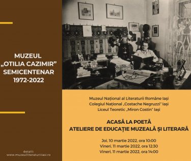 Muzeul Național al Literaturii Române din Iași (MNLR Iași) organizează joi și vineri, 10-11 martie, la Muzeul ,,Otilia Cazimir” ateliere de educație muzeală și literară incluse în programul Semincentenar Muzeul „Otilia Cazimir” și în CAEJ 2022 (proiectul „Educație prin cultură”). Activitățile „Acasă la poetă” vor …