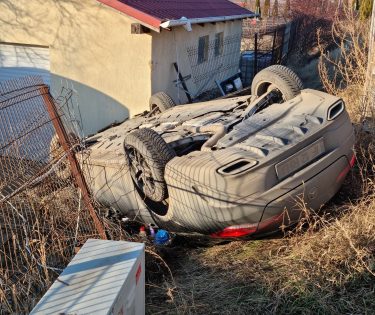 O șoferiță aflată la volanul unui SUV Mercedes a pierdut controlul mașinii într-o curbă, la Breazu și s-a răsturnat în curtea unei case, după ce a rupt gardul.