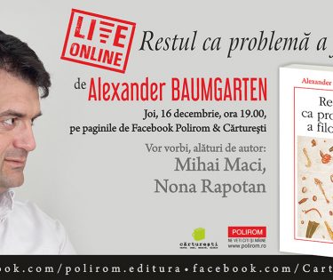 Restul ca problemă a filosofiei de Alexander Baumgarten, Editura Polirom, colecția „Plural”, 2021 Joi, 16 decembrie, ora 19.00, pe paginile de Facebook Polirom & Cărturești facebook.com/polirom.editura facebook.com/Carturesti Vor vorbi, alături de autor: Mihai Maci, Nona Rapotan „Nimic din mintea mea nu îmi arată …
