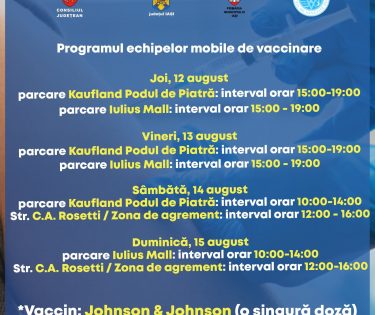 vezi stireaCampania de vaccinare continuă la Iași. Echipele mobile de vaccinare vor funcționa în mai multe zone importante din municipiul Iași, de joi până duminică