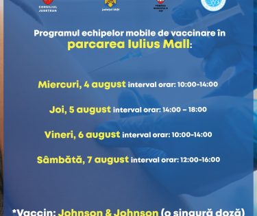 Ieșenii care vor să se vaccineze în aceste zile o pot face în parcarea Iulius Mall, unde joi, vineri și sâmbătă vor fi echipele mobile de vaccinare.
