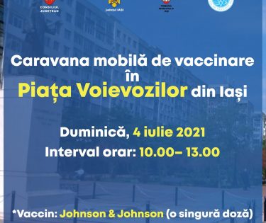 Caravana mobilă de vaccinare va poposi duminică, 4 iulie, în Piața Voievozilor din Iași.
