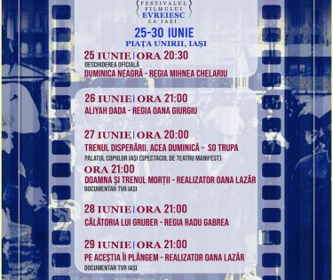 În perioada 25 – 30 iunie 2021 va avea loc prima ediție a Festivalului Filmului Evreiesc la Iași, organizat cu ocazia comemorării a 80 de ani de la Pogromul de la Iaşi.