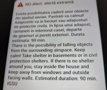 Un mesaj RO-Alert a fost emis în Constanța, joi seară, referitor la posibilitatea căderii unor drone. Populația a fost sfătuită să se adăpostească în beciuri sau adăposturi de protecție civilă sau, în lipsa unui adăpost, să rămână în case, departe de pereții exteriori și geamuri.