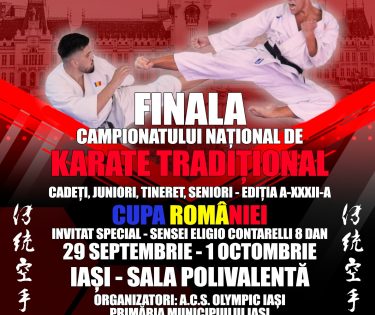 Sala Polivalentă din Iași va găzdui, de astăzi și până duminică, 1 octombrie, ediția a 32-a a finalei Campionatului Național de Karate Tradițional pentru cadeți, juniori, tineret și seniori. Evenimentul va reuni pe tatami peste 200 de sportivi de la 32 de cluburi din țară și este organizat de clubul ACS Olympic Iași, condus de Petronel Luca.
