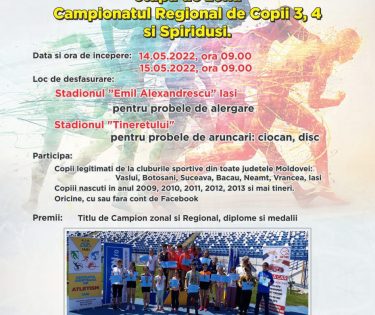 vezi stireaWeek-end plin pentru micii atleți. Sâmbătă și duminică au loc la Iași Campionatul Național de Copii 1, 2 – Etapa de zonă și Campionatul Regional de Copii 3, 4 și Spiriduși