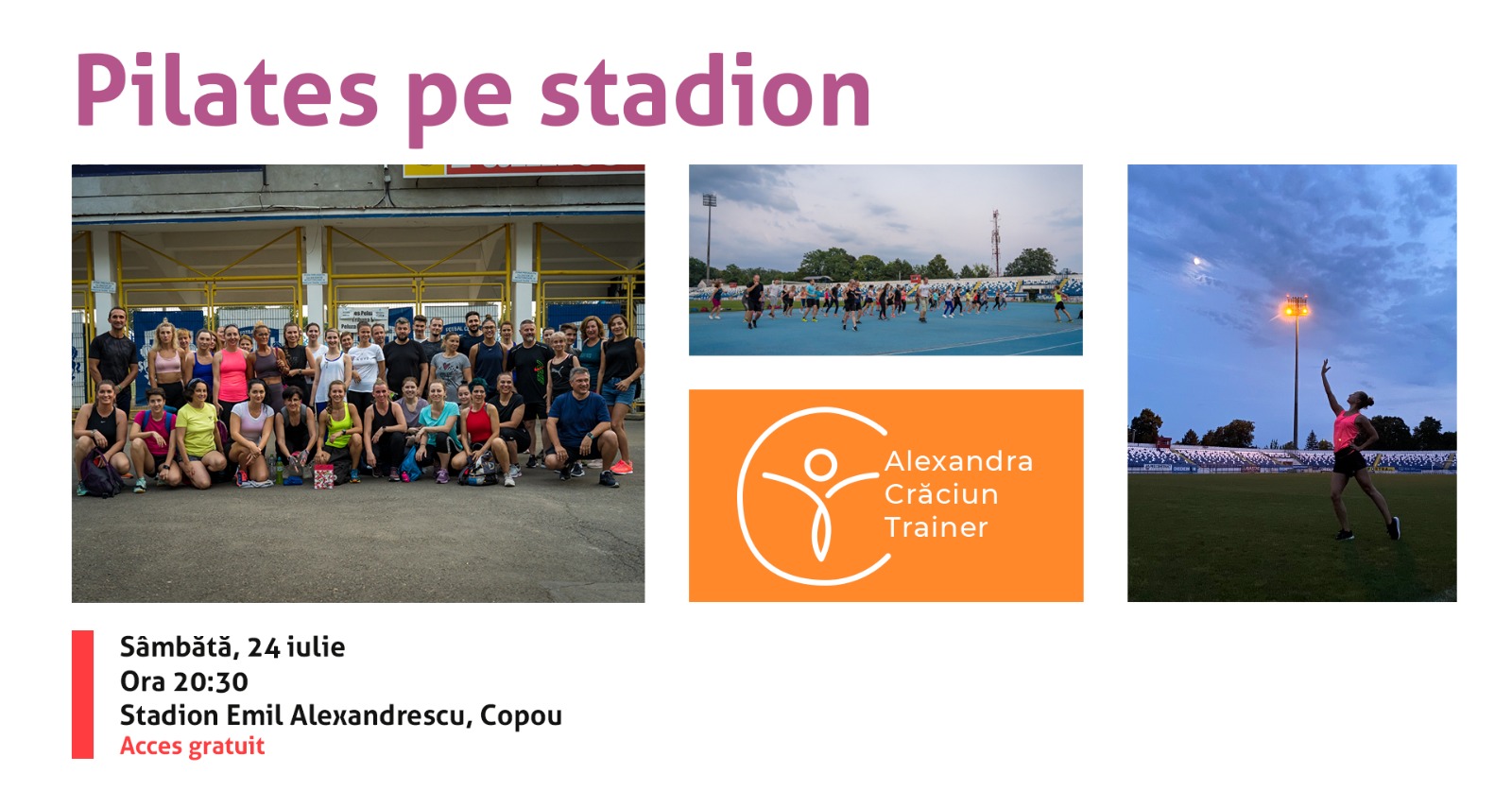 „Sâmbătă, 24 iulie 2021, de la 20:30 vă invit cu toată inima la un antrenament de Pilates pe stadionul Emil Alexandrescu.