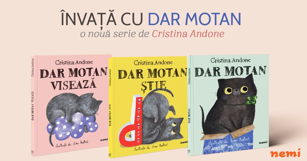În librărillie din țară găsim o nouă serie de cărți pentru copii scrisă de Cristina Andone: DAR MOTAN, cu volumele Dar Motan, Dar Motan visează, Dar Motan știe, perfecte pentru primele lecturi ale copiilor.