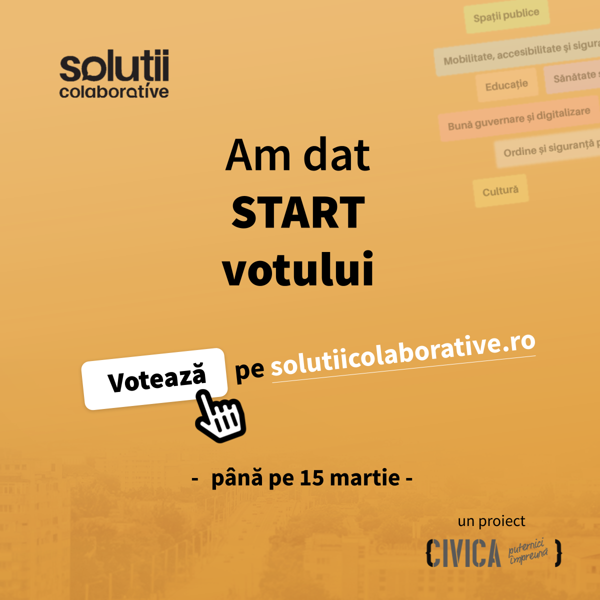 Intră pe https://solutiicolaborative.ro/vote-problem-categories și alege provocarea cea mai relevantă pentru tine pe fiecare domeniu.