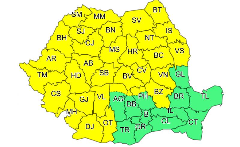 O atenţionare cod galben de ploi torenţiale şi vijelii pentru 31 de judeţe a intrat în vigoare vineri dimineaţa, în timp ce la nivelul întregii ţări va fi valabilă, până sâmbătă dimineaţa, o informare meteo de instabilitate atmosferică accentuată.