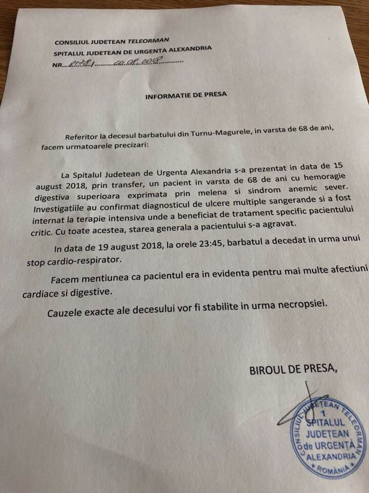 După ce Ilie Gâzea, din Turnu Măgurele, în vârstă de 62 de ani, a decedat luni dimineață la Spitalul Județean din Alexandria, unitatea medicală a revenit cu o serie de precizări.”Cauzele exacte ale decesului vor fi stabilite în urma necropsiei”, transmit reprezentanții Spitalul Județean din Alexandria, care precizează că bărbatul avea ulcere multiple.