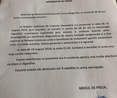 După ce Ilie Gâzea, din Turnu Măgurele, în vârstă de 62 de ani, a decedat luni dimineață la Spitalul Județean din Alexandria, unitatea medicală a revenit cu o serie de precizări.”Cauzele exacte ale decesului vor fi stabilite în urma necropsiei”, transmit reprezentanții Spitalul Județean din Alexandria, care precizează că bărbatul avea ulcere multiple. Ilie Gâzea participase pe …