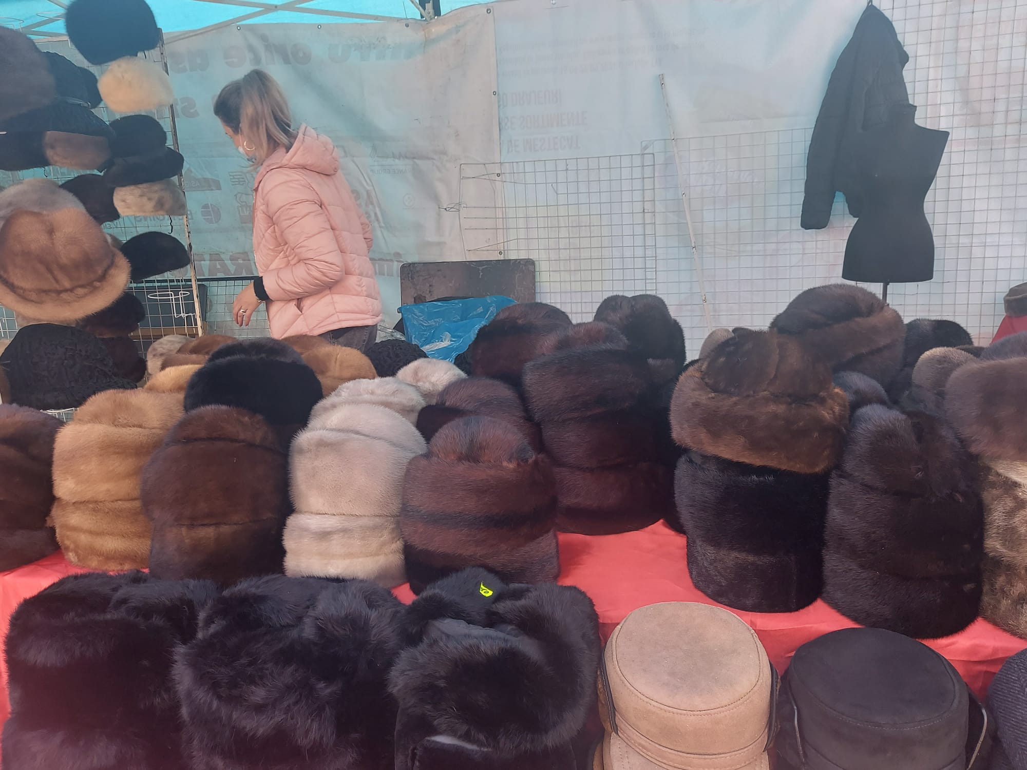 „Suntem de zece ani aici, de când venim la Târgul de blănuri din Iași. Cel mai bun an a fost acum vreo trei-patru ani în urmă. Anul trecut, cu pandemia, a fost foarte slab. Să vedem anul acesta cum va fi. Așteptăm să vină pelerinajul, să îi lase să vină. Anul trecut nu am avut numai cu ieșenii, să vedem dacă îi lasă acum. Avem căciuli din blană naturală de vulpe, nurcă, de astrahan, produsele noastre românești. Noi venim din Piatra Neamț. Prețurile sunt mici, de producător, de exemplu 150 de lei cea de nurcă pentru damă, 100 de lei astrahanul. Prețurile sunt la jumătate pentru că lumea nu mai are bani. Anul trecut nu ne-am scos cheltuielile. A fost foarte slab. Îi așteptăm pe ieșeni să vină, prețurile sunt negociabile, produsele sunt românești”, spune un domn care de zece ani participă la Târgul de blănuri organizat la Iași.