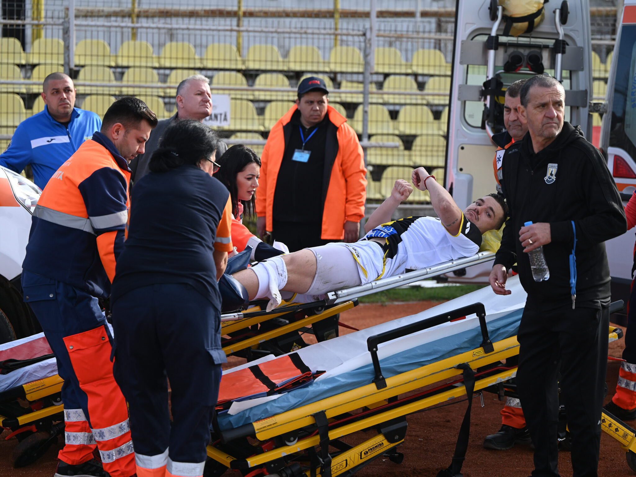 În scurt timp, pe teren a intrat ambulanța, iar timp de zece minute medicii i-au acordat îngrijiri medicale pe gazon lui Stejărel Vișinar, după care fotbalistul a fost urcat cu targa în ambulanță.