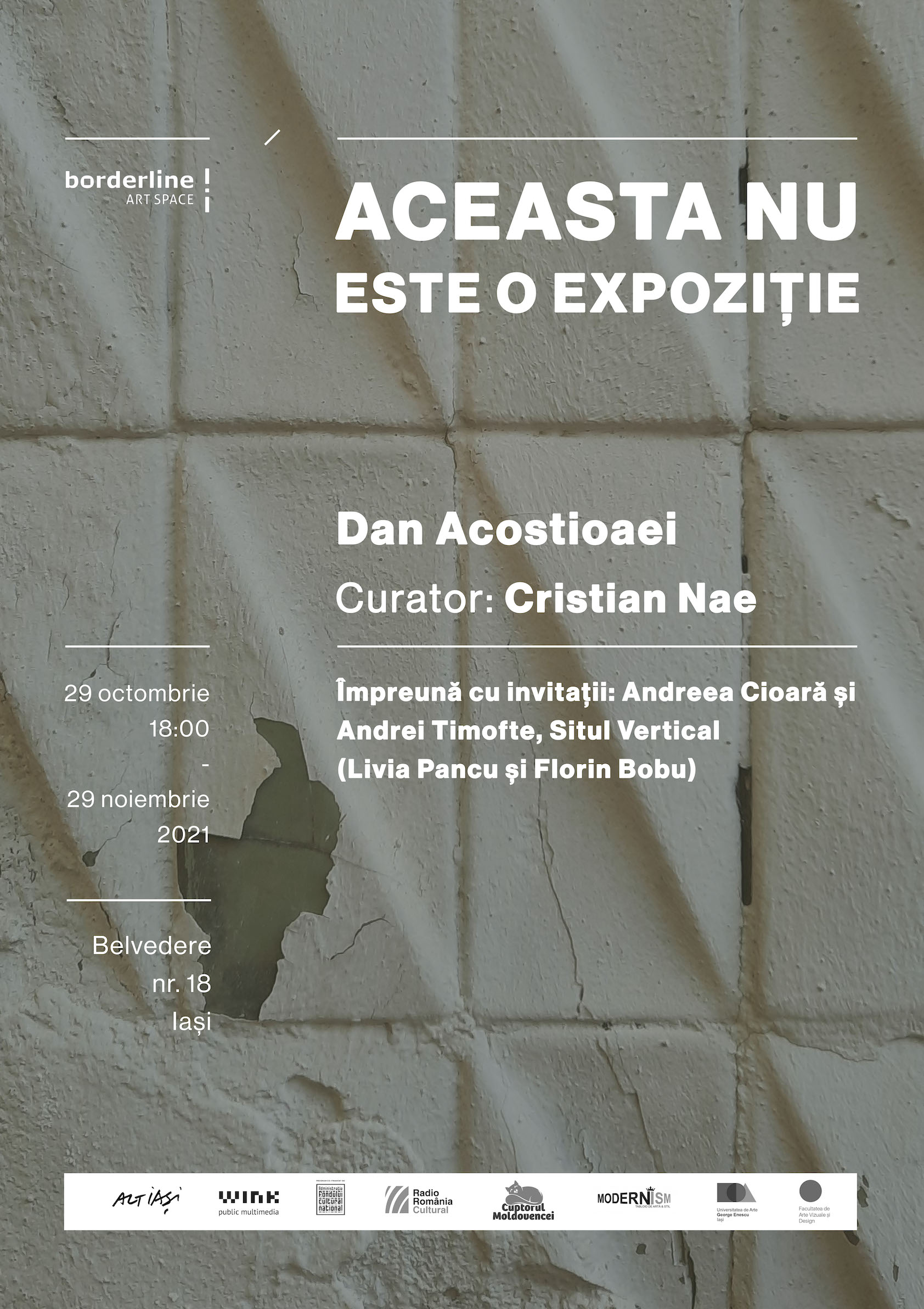 Borderline Art Space găzduiește vineri, 29 octombrie 2021, începând cu ora 18, deschiderea expoziției „Aceasta nu este o expoziție”, a artistului Dan Acostioaei, realizată în colaborare cu Situl vertical (Livia Pancu + Florin Bobu), Andreea Cioară și Andrei Timofte. Expoziția, curatoriată de Cristian Nae, poate fi vizitată până la 29 noiembrie 2021 la adresa din strada Belvedere nr. 18, cu respectarea tuturor normelor sanitare în vigoare.
