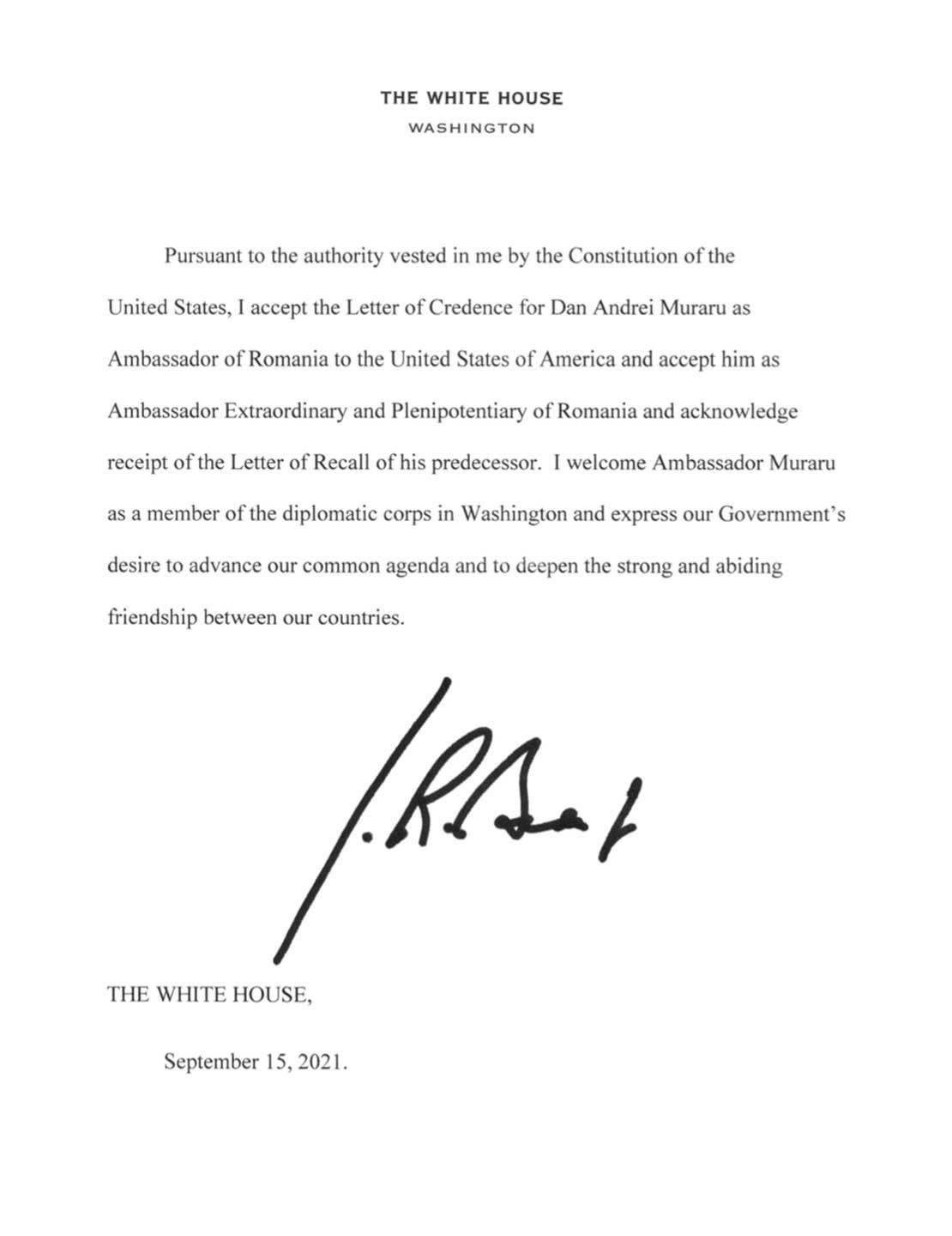 Deputatul Andrei Muraru anunță că este onorat să primească scrisoarea Președintelui Joe Biden, prin care este oficial acreditat, cu drepturi depline, ca ambasador extraordinar și plenipotențiar al României în SUA.