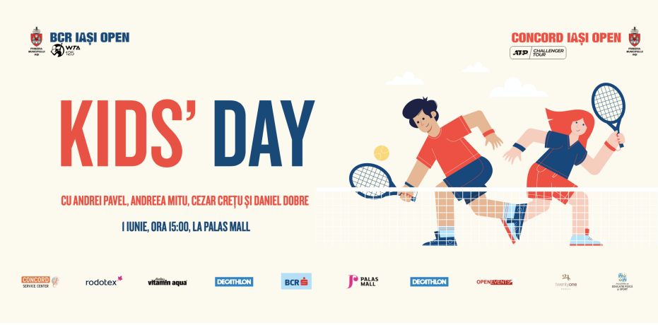 Kids’ Day va avea loc miercuri, 1 iulie, la Palas Mall, de la ora 15.00. Andrei Pavel, Andreea Mitu, Daniel Dobre și Cezar Crețu vor juca tenis cu copiii pe 4 miniterenuri amenajate în Grădina Palas, cu sprijinul Decathlon.
