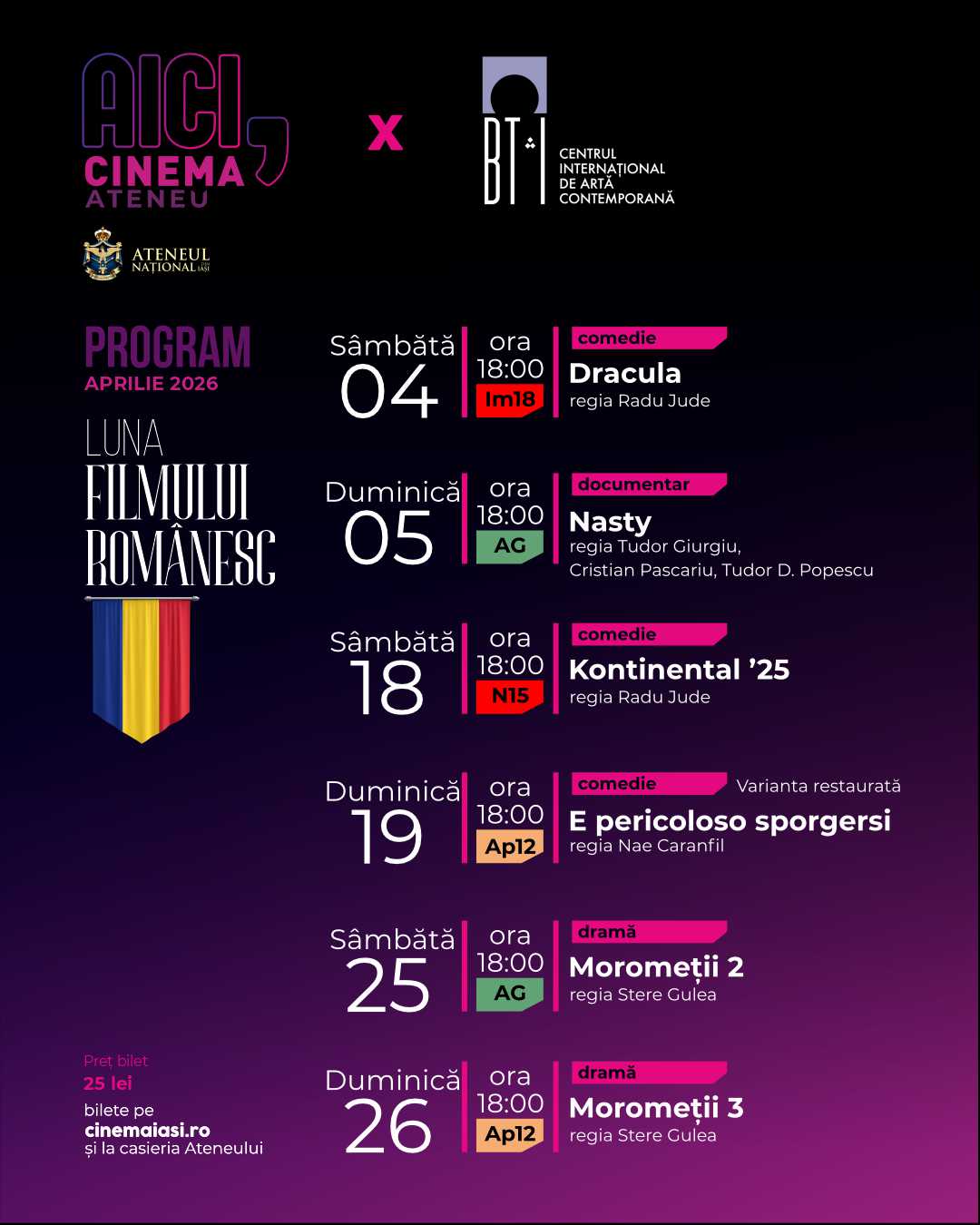 Se știe că filmul românesc are un loc aparte la Cinema Ateneu. Pentru că primele trei luni ale anului 2026 le-am dedicat producțiilor internaționale, ne-a venit ideea ca luna aprilie să fie dedicată filmului românesc.