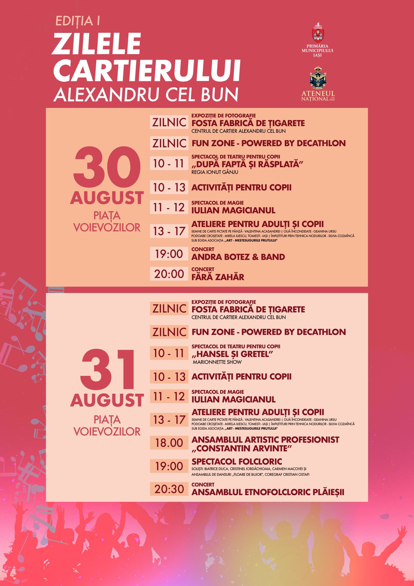 Serile sunt dedicate celor mari. În prima seară, sâmbătă, 30 august, am pregătit două formații de muzică ușoară care vor ridica atmosfera în Piața Voievozilor din Alexandru: Andra Botez Band și trupa Fără Zahăr. Duminică, ziua este rezervată folclorului, cu artiști locali și cu Ansamblul etno-folcloric Plăieșii.