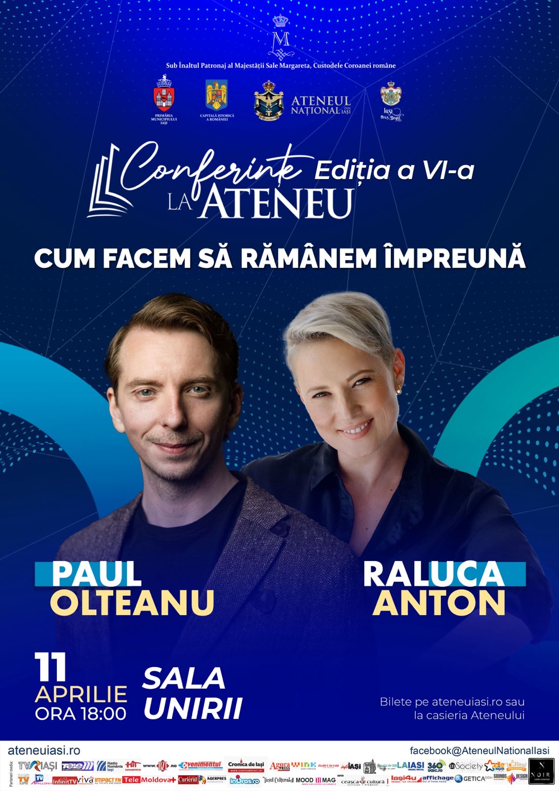 11 aprilie, ora 18, marchează, pentru Ateneul Național din Iași, data și ora a două conferințe adresate comunității ieșene. „Cum facem să rămânem împreună?” este conferința ce îi are ca invitați pe Paul Olteanu și Raluca Anton, și care vizează importanța relațiilor interumane și modul în care putem învăța să facem față provocărilor zilnice. Cea de-a doua, „Cuvânt și Melos: Piedici și trepte în drumul spre Înviere”, va urmări semnificația Paștelui și cum ne putem pregăti spiritual pentru sărbători. Alături de noi este Teo Cristofor, organizatorul celor două conferințe.