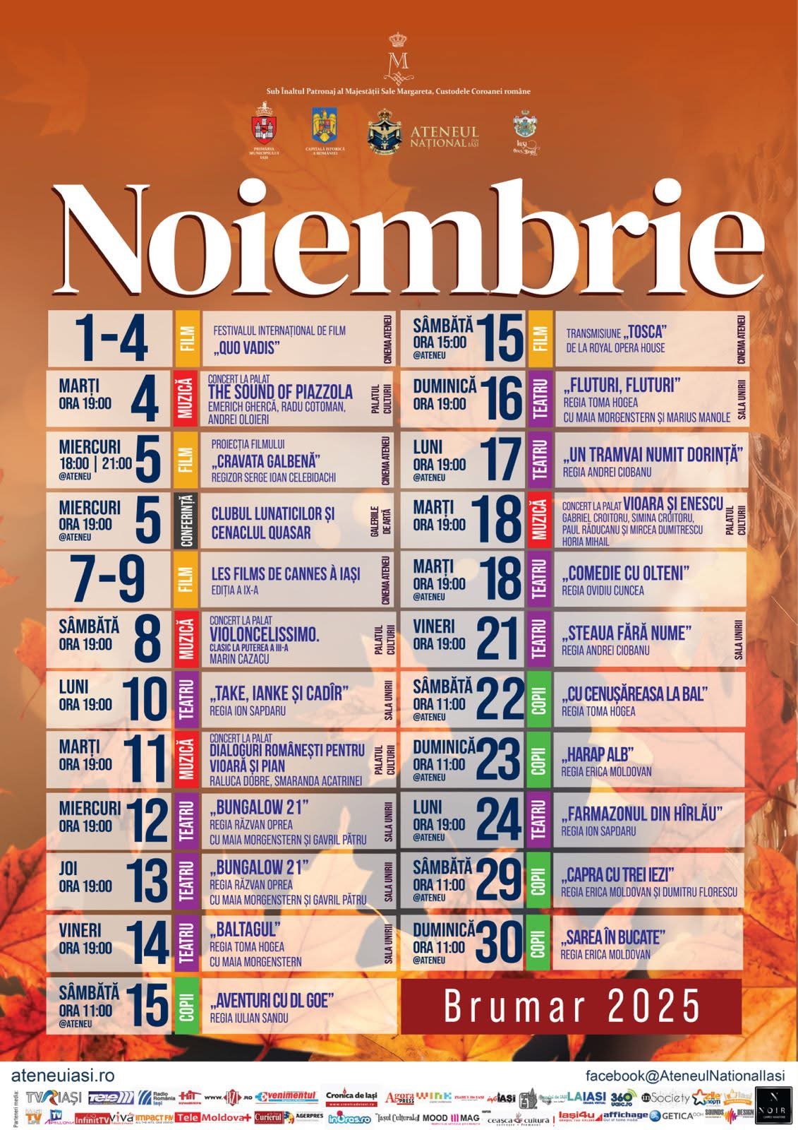 Pe 25 noiembrie poate fi văzut „Farmazonul din Hârlău”, în regia lui Ion Sapdaru, un spectacol cu tentă locală și regională, care aduce în prim-plan tradiția și imaginarul moldovenesc. Pe 26 noiembrie este programată „Capra cu trei iezi”, în versiune pentru adulți, o reinterpretare matură a basmului popular, iar pe 30 noiembrie revine „Sarea în bucate”, tot în versiunea dedicată celor mari, o încheiere a lunii printr-o producție care îmbină realismul popular cu simbolismul.