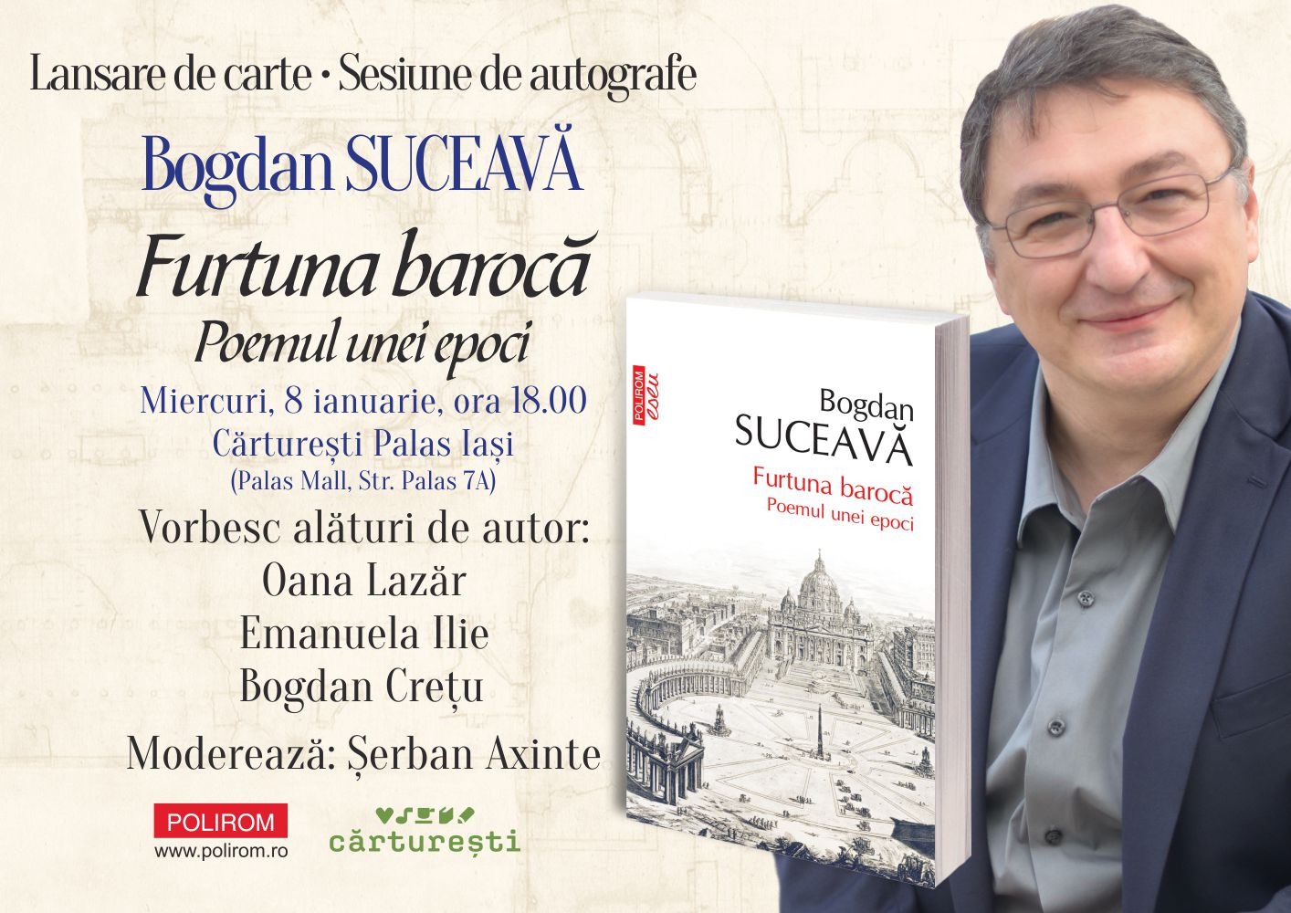 Miercuri, 8 ianuarie 2025, ora 18.00, la Librăria Cărturești Palas Iași (Palas Mall, Str. Palas 7A), va avea loc lansarea volumului Furtuna barocă. Poemul unei epoci de Bogdan Suceavă, publicat în colecția „Eseuri și confesiuni” a Editurii Polirom.