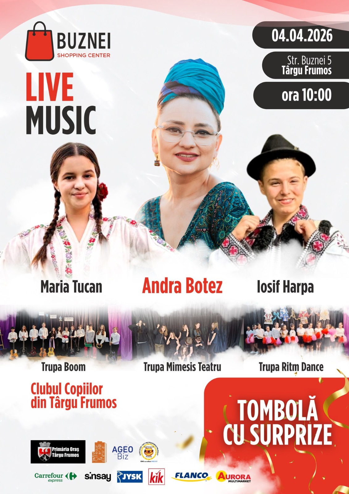 Concertul muzical va avea loc sâmbătă, 04 aprilie, începând cu ora 10:00, la sediul centrului comercial situat pe Str. Buznei nr. 5, Târgu Frumos, și va aduce împreună artiști consacrați, activități recreative și oferte speciale pentru vizitatori.