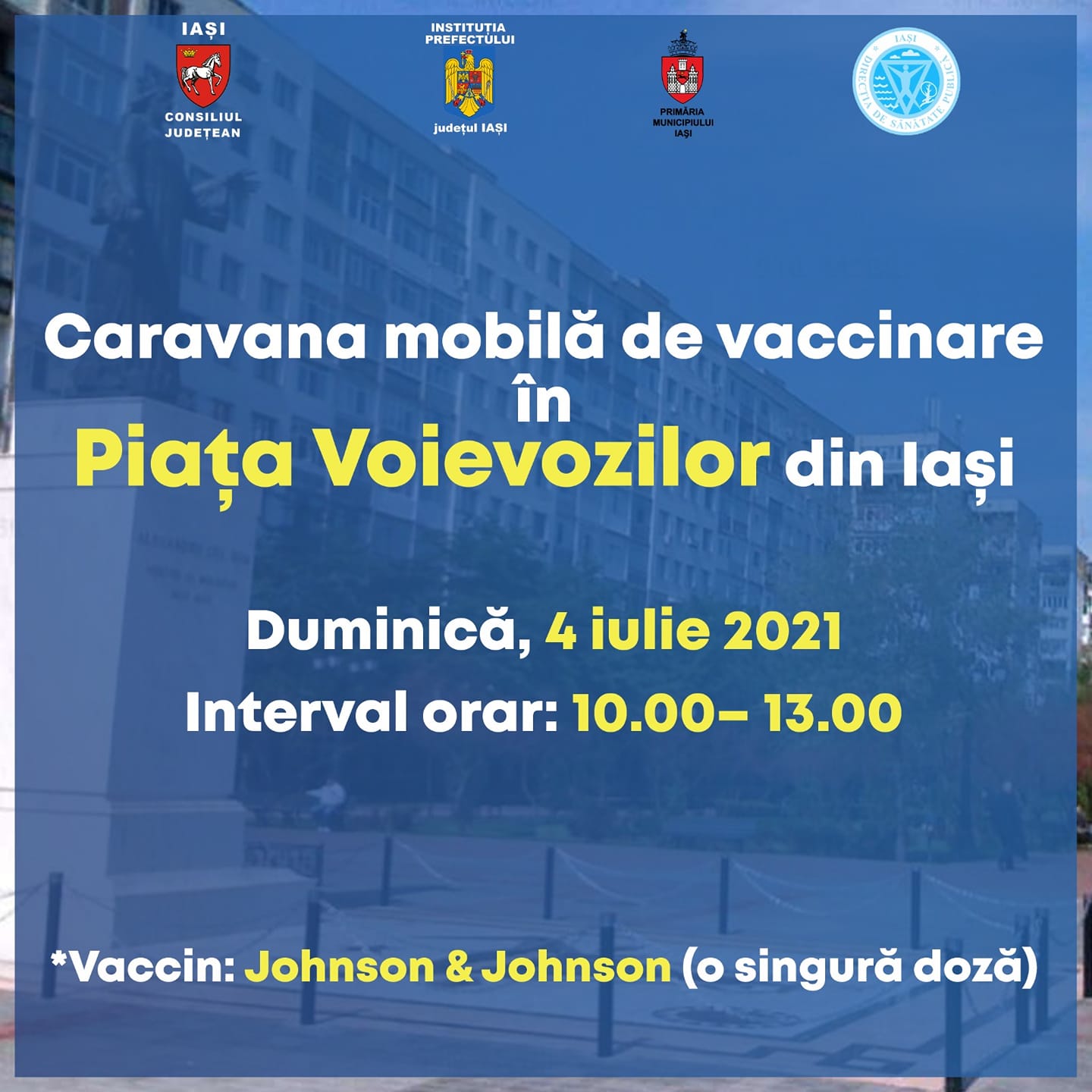 Caravana mobilă de vaccinare va poposi duminică, 4 iulie, în Piața Voievozilor din Iași.