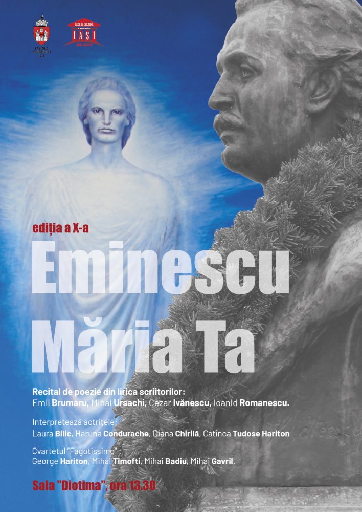 Cu ocazia Zilei Culturii Naționale și împlinirii a 172 de ani de la nașterea lui Mihai Eminescu, Casa de Cultură „Mihai Ursachi” a Municipiului Iași organizează sâmbătă, 15 ianuarie 2022, a X-a ediție a evenimentului „Eminescu, Măria Ta”.
