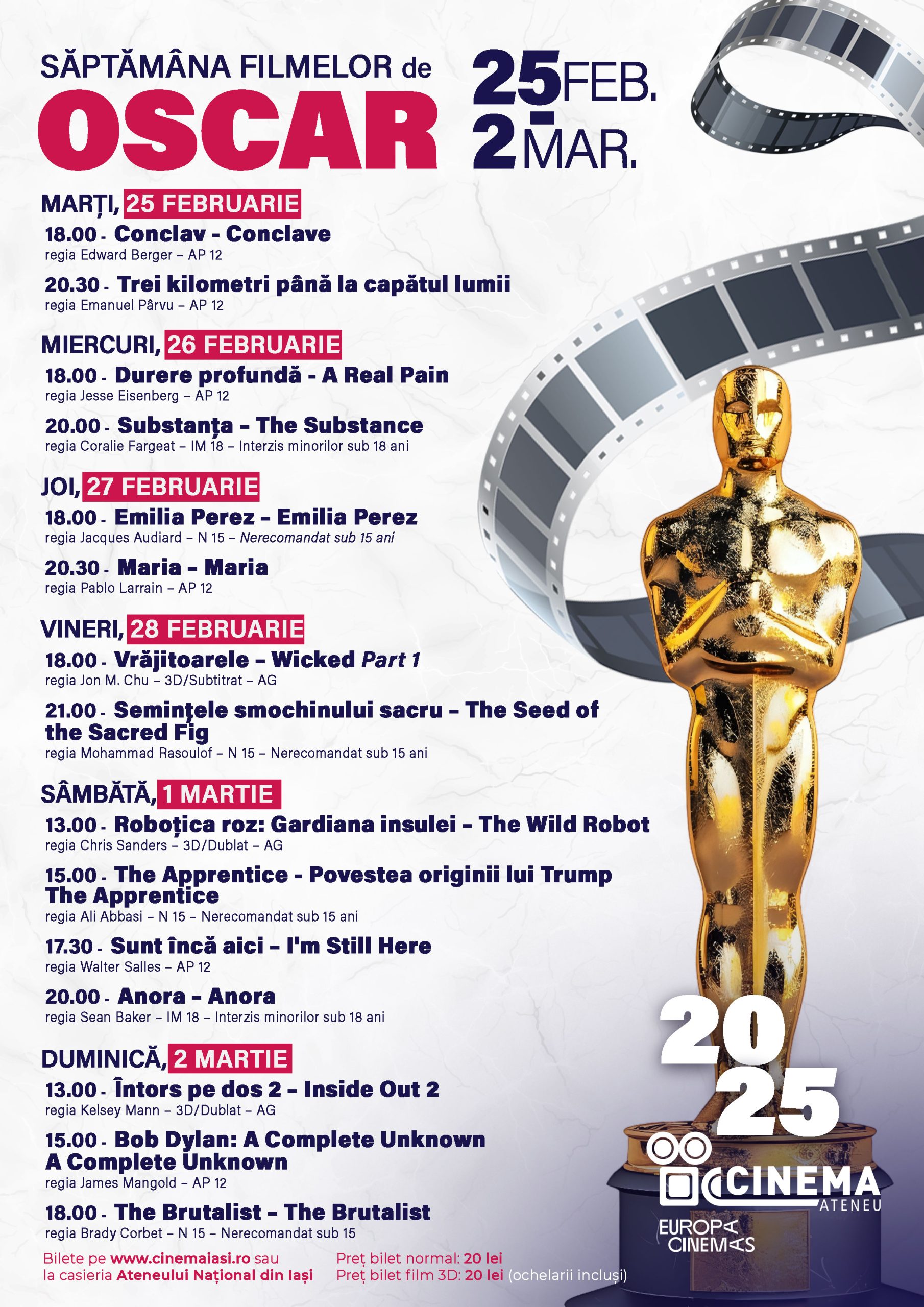 Andrei Giurgia, coordonator al activității la Cinema Ateneu: “Iată că și anul acesta reușim, prin Săptămâna Filmelor de Oscar, să aducem o selecție generoasă de producții cinematografice. Sunt dintre cele mai cunoscute și mai urmărite filme în întreaga lume, așa că este o ocazie deosebită pentru cinefili să descopere pelicule memorabile și nominalizate la Premiile Oscar. Anul acesta, avem și ocazia să îl vedem pe actorul american de origine română, Sebastian Stan, în filmul <<The Apprentice>> ”.