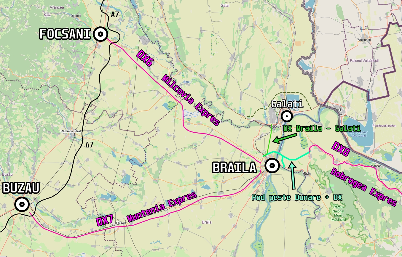 Drumul Expres Focșani-Brăila, cu lungime de 73 kilometri, va asigura legătura între Autostrada Moldovei Ploiești-Pașcani (A7), Podul peste Dunăre de la Brăila, Drumul Expres Brăila-Galați (DEx 6), Tulcea și Constanța.