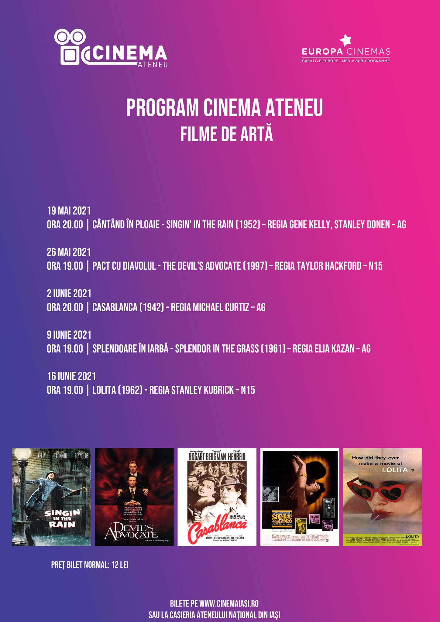 Din luna mai, cele mai cunoscute capodopere ale cinematografiei vor rula pe ecranul de la Cinema Ateneu, iar ieșenii se vor putea bucura de filme care au schimbat istoria cinematografiei. Astfel, începând cu 19 mai 2021, ziua de miercuri a săptămânii va deveni ziua filmelor de artă.