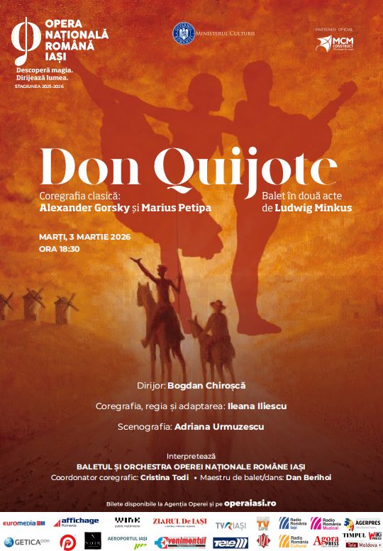 Opera Națională Română din Iași programează mâine primul spectacol al lunii martie. De la ora 18:30, în Sala Mare, iubitorii baletului sunt așteptați la o nouă întâlnire cu spectacolul „Don Quijote”, de Ludwig Minkus.