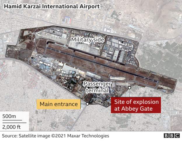 Exploziile, din câte se pare, au avut loc la Poarta Abbey a Aeroportului Internațional „Hamid Karzai”, în apropiere de Hotel Baron, unde reprezentanții Marii Britanii procesează actele afganilor și britanicilor care se urcă în avioanele RAF.