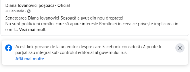 Contul de Facebook al senatorului Diana Șoșoacă a fost marcat de către rețeaua de socializare drept cont aparținând unui politician aflat parțial sau total sub controlul Rusiei.