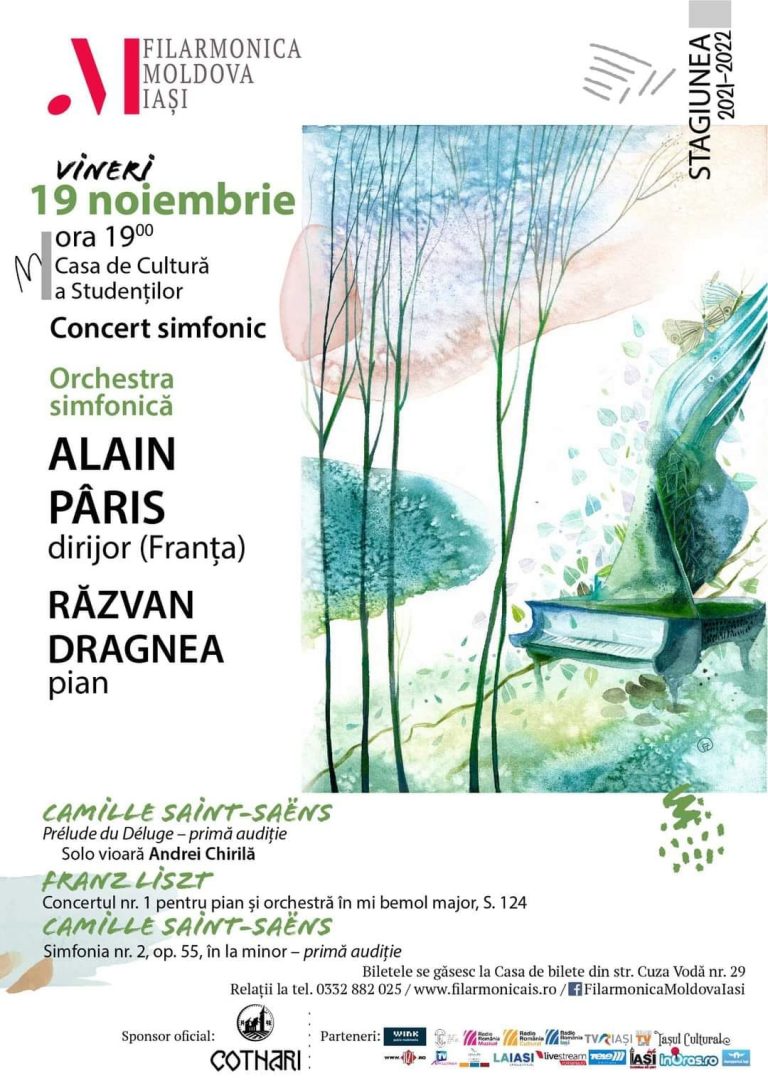 Vineri, 19 noiembrie 2021, ora 19,00, orchestra simfonică a Filarmonicii „Moldova” din Iași va susține la Casa de Cultura a Studenților Iași un concert simfonic sub bagheta dirijorului Alain Pâris (Franța).