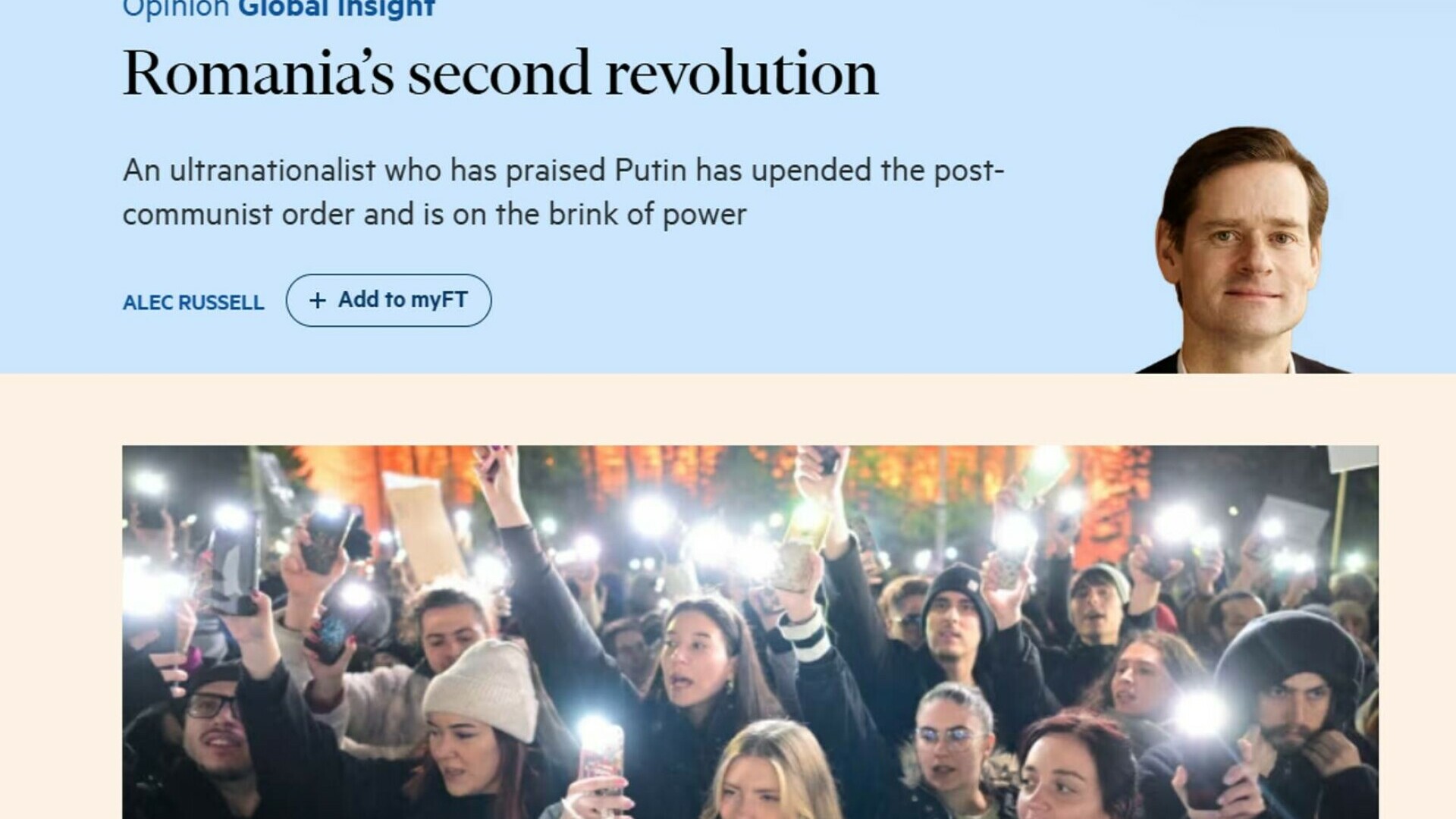 Un ultranaţionalist care l-a lăudat pe Putin a răsturnat ordinea postcomunistă şi este pe punctul de a prelua puterea în România, scrie joi jurnalistul Alec Russell, editor de politică externă la Financial Times.