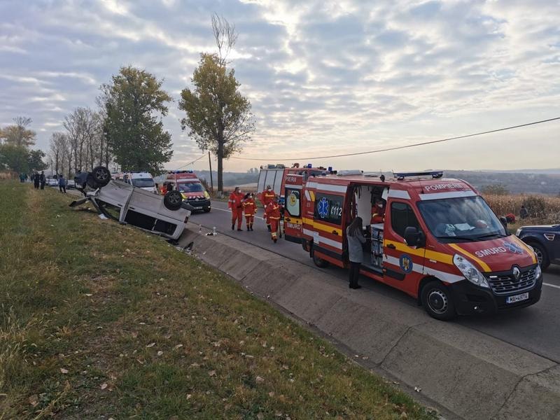 FOTO – ACCIDENT GRAV la Șipote! O dubiță s-a răsturnat, după ce a intrat în plin într-o căruță. A intervenit elicopterul SMURD