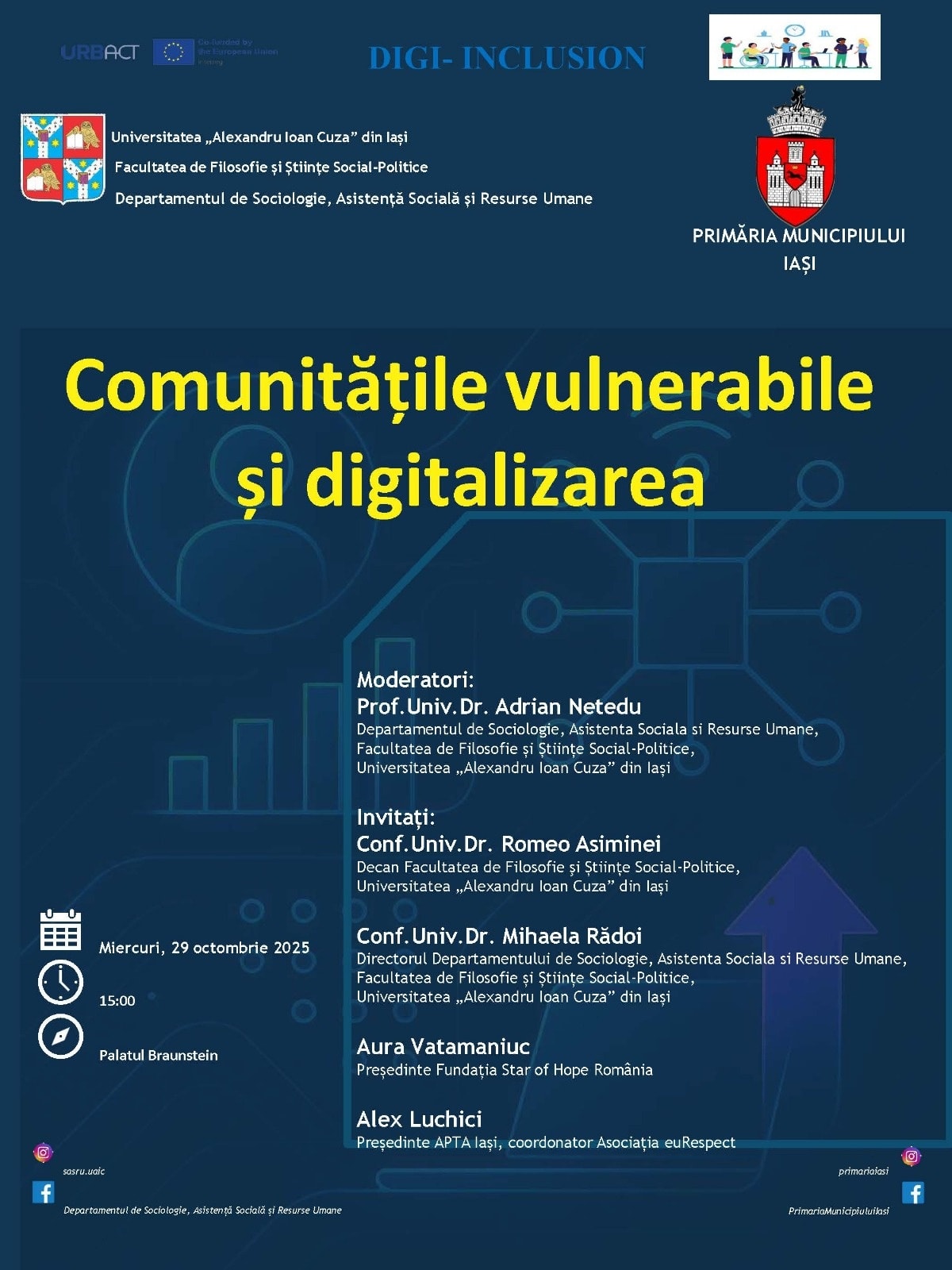 Municipiul Iași, în parteneriat cu Facultatea de Filosofie și Științe Social-Politice din cadrul Universității „Alexandru Ioan Cuza”, organizează o dezbatere publică pe tema „Comunitățile vulnerabile și digitalizarea”. Evenimentul face parte din proiectul transnațional Digi-Inclusion, finanțat prin programul URBACT, și se desfășoară în cadrul Zilelor Universității „Alexandru Ioan Cuza”.