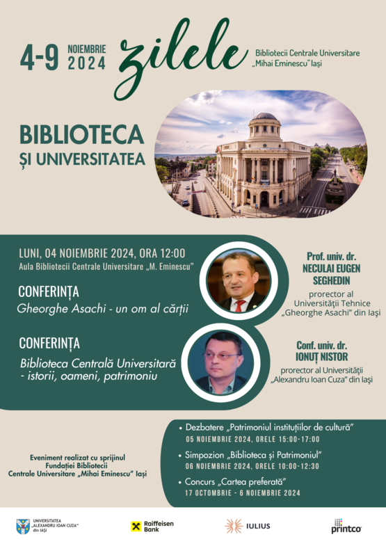 Cunoscută sub denumirea Zilele Bibliotecii Centrale Universitare „Mihai Eminescu” Iaşi (4–9 noiembrie 2024), seria de activități constituie un prilej pentru a dezbate teme actuale din domeniul științei informării și documentării. Ediția din acest an se desfășoară sub titlul BIBLIOTECA ȘI UNIVERSITATEA.
