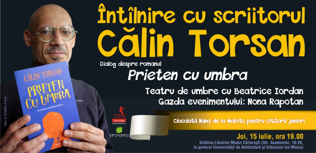 Joi, 15 iulie, ora 19.00, în Grădina Librăriei Modul Cărturești (București, Str. Academiei, 18-20, la parterul Universității de Arhitectură și Urbanism „Ion Mincu”), va avea loc o întâlnire cu scriitorul Călin Torsan, cu prilejul lansării romanului Prieten cu umbra, cu ilustrații de Daniel Ionescu, apărut în colecția Junior a Editurii Polirom.