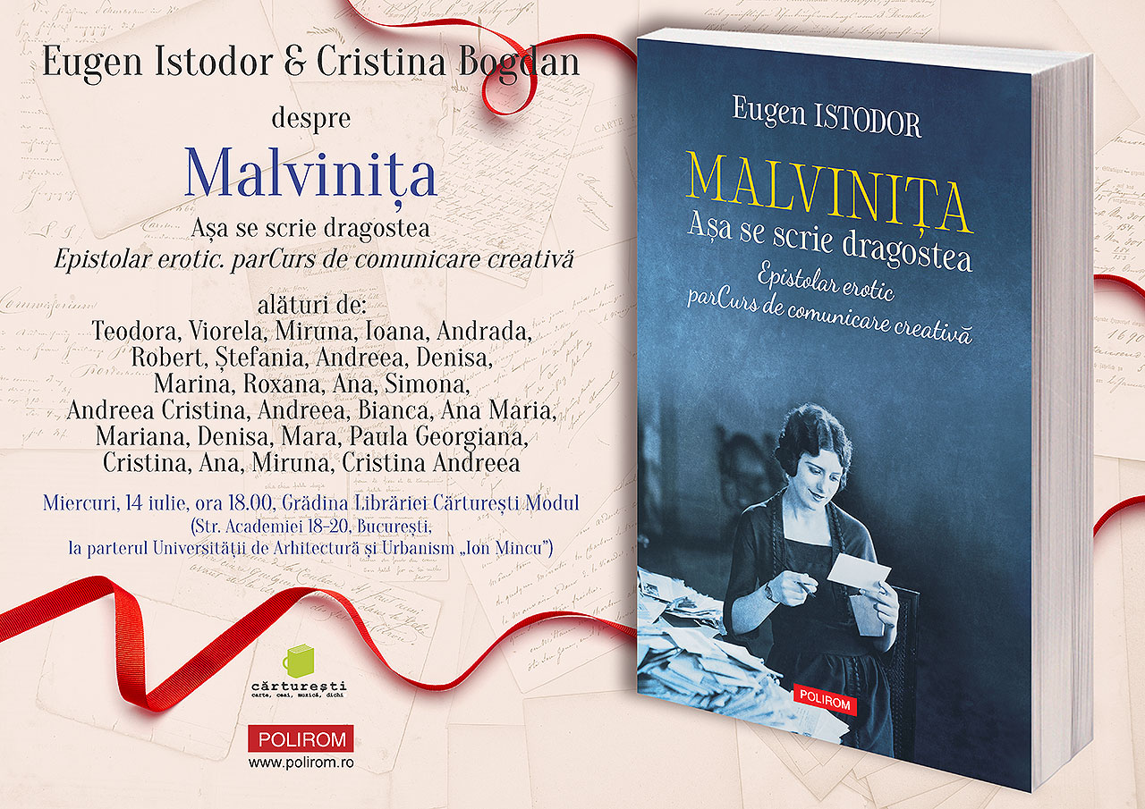 Miercuri, 14 iulie, ora 18.00, în Grădina Librăriei Cărturești Modul din București (Str. Academiei, nr. 18-20, la parterul Universității de Arhitectură și Urbanism „Ion Mincu”), va avea loc lansarea volumului Malvinița. Așa se scrie dragostea. Epistolar erotic. parCurs de comunicare creativă de Eugen Istodor, apărut de curând la Editura Polirom.