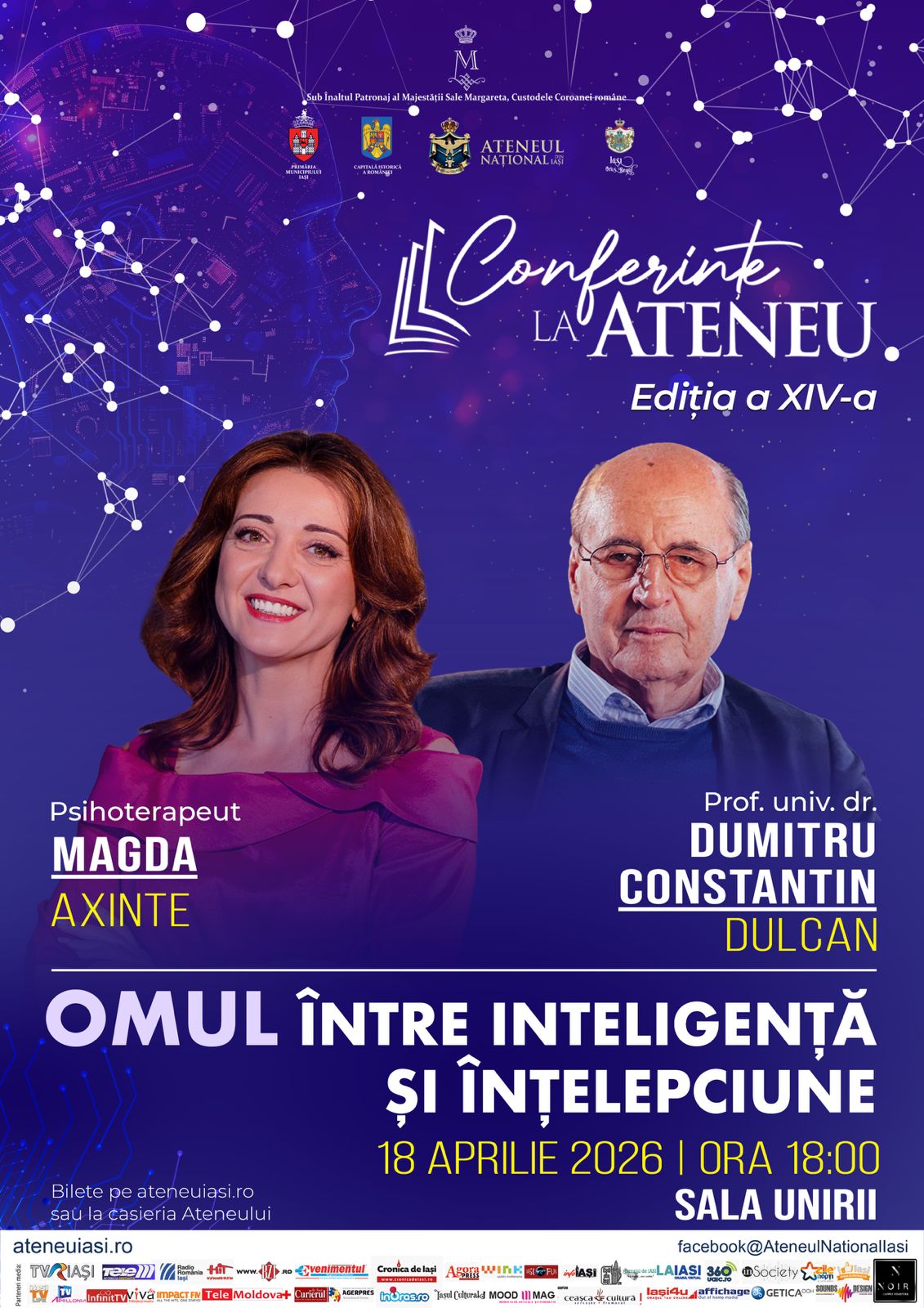 Ateneul Național din Iași găzduiește o nouă ediție a Conferințelor la Ateneu, un eveniment care aduce în prim-plan dialoguri despre om, minte și societate. Pe 18 aprilie, de la ora 18:00, în Sala Unirii, publicul este invitat la conferința „Omul între inteligență și înțelepciune”, susținută de prof. univ. dr. Dumitru Constantin Dulcan, alături de psihoterapeutul Magda Axinte.