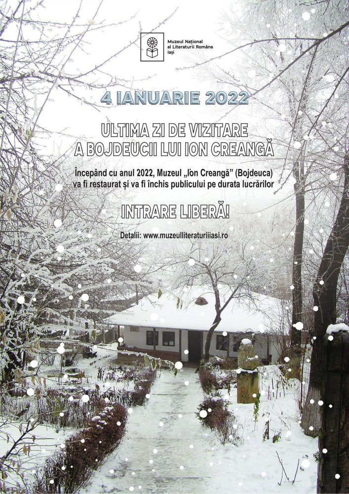 Marți, 4 ianuarie 2022, va fi prima și ultima zi din an în care se mai poate vizita Muzeul „Ion Creangă” (Bojdeuca), iar intrarea va fi gratuită.