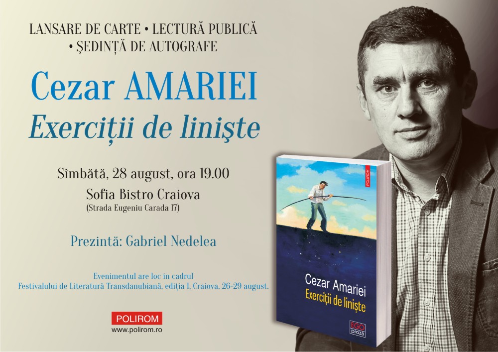 Sâmbătă, 28 august, la ora 19.00, la Sofia Bistro din Craiova (Str. Eugeniu Carada, nr. 17), va avea loc lansarea romanului Exerciții de liniște de Cezar Amariei, apărut de curând la Editura Polirom.