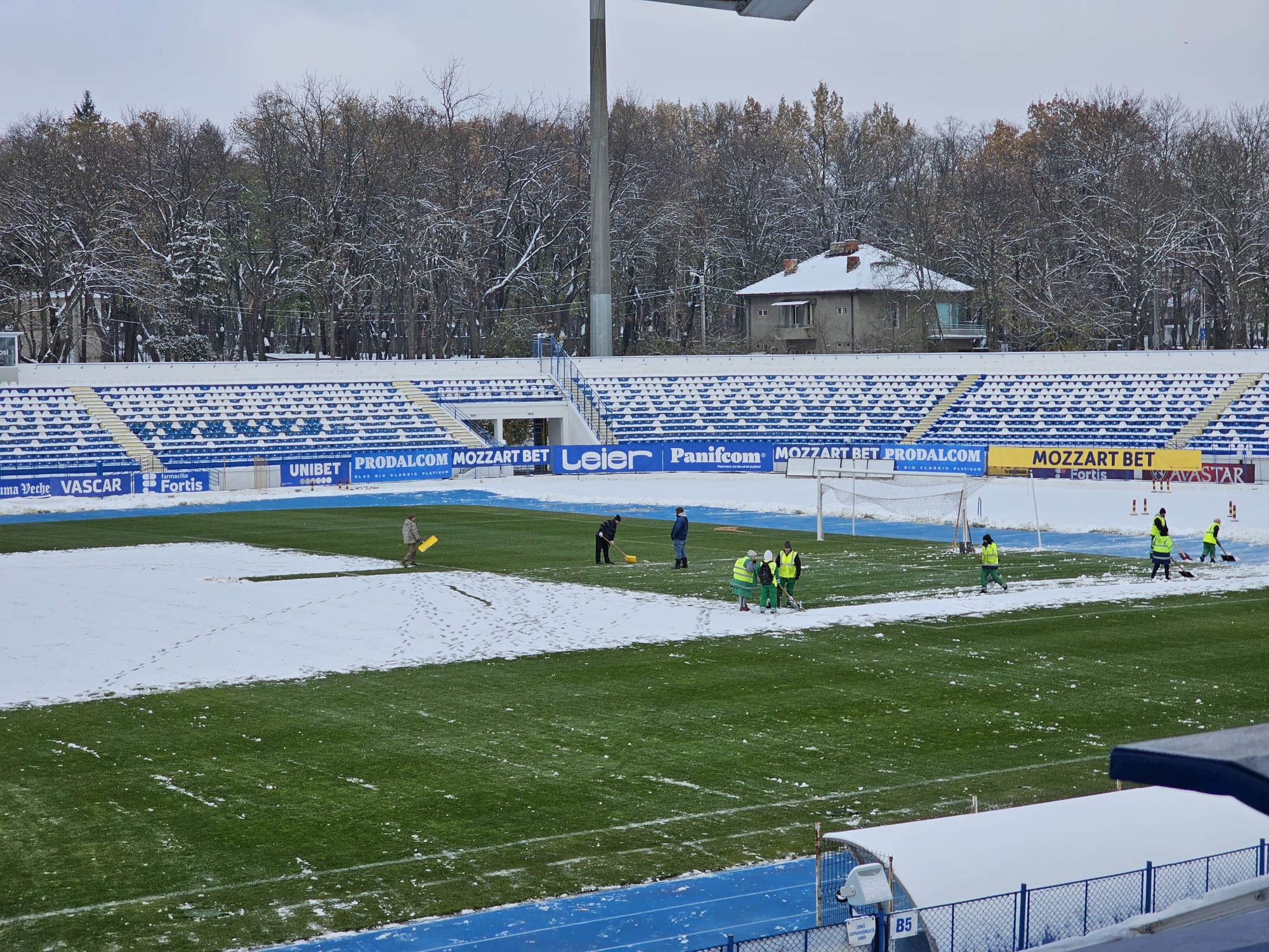 În cursul dimineții suprafața de joc era acoperită în întregime de zăpadă, însă în doar șase ore terenul a fost curățat de către lucrătorii municipalității. Cot la cot cu angajații de la Servicii Publice a lucrat și antrenorul Iașiului, Leo Grozavu, care a pus mâna pe lopată și a ajutat la deszăpezirea terenului.
