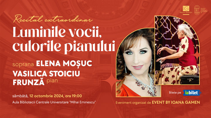 Luminile vocii, culorile pianului se unesc într-o frumoasă seară de octombrie în cadrul unui recital extraordinar susținut de Elena Moșuc, una dintre cele mai valoroase soprane ale lumii, acompaniată la pian de Vasilica Stoiciu-Frunză.