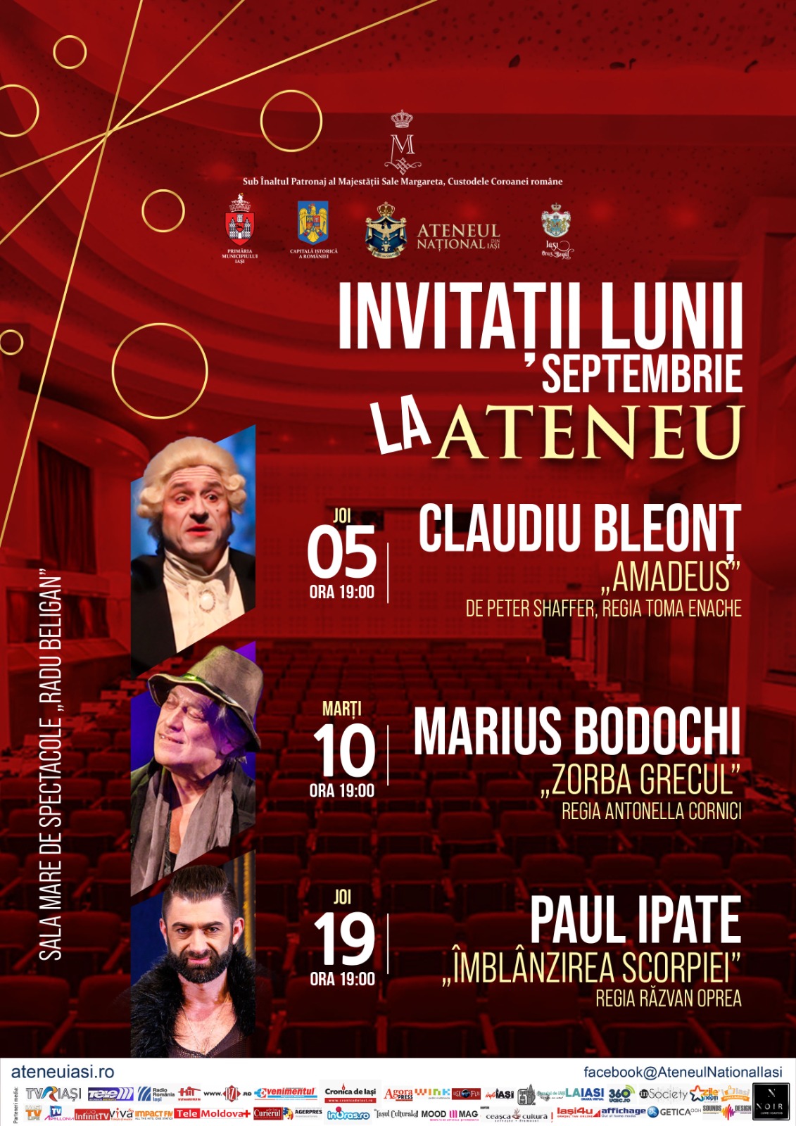 Pe 8 septembrie, într-un spectacol regizat de Antonella Cornici, protagonistul principal din spectacolul Zorba grecul va fi Marius Bodochi iar pe 19 septembrie, Paul Ipate va juca alături de actorii Ateneului în spectacolul Îmblânzirea Scorpiei. Cele trei spectacole vor fi prezentate la Sala Mare de Spectacole „Radu Beligan” de la ora 19:00. „Pentru luna septembrie am pregătit un program diversificat cu spectacole susținute de actorii noștri, evenimente în colaborare cu alte echipe de teatru dar și spectacole inedite alături de invitați speciali. Luna aceasta îi avem invitați pe actorii Claudiu Bleonț, Marius Bodochi și Paul Ipate, care vin cu plăcere în fața publicului și cu această ocazie dorim să le mulțumim pentru efortul și pasiunea lor pentru producțiile marca Ateneul Național din Iași.